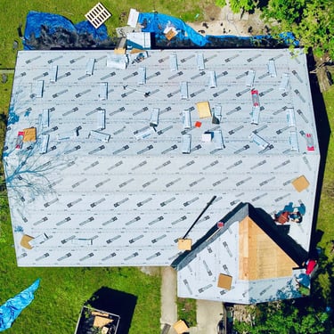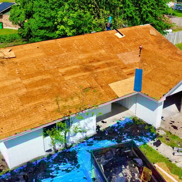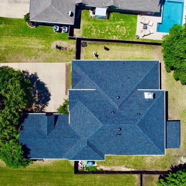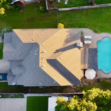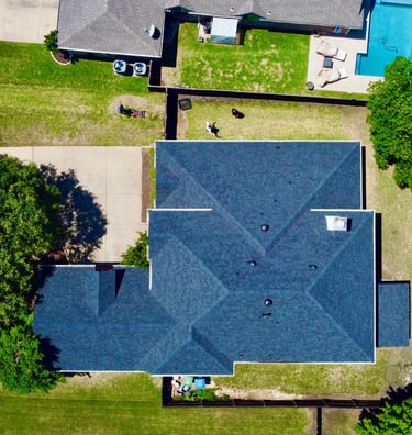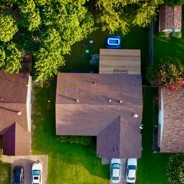 Aerial drone shots showcasing roofing work and renovations from above — ideal for highlighting project quality, progress, and dramatic transformations with clear, high-impact visuals.